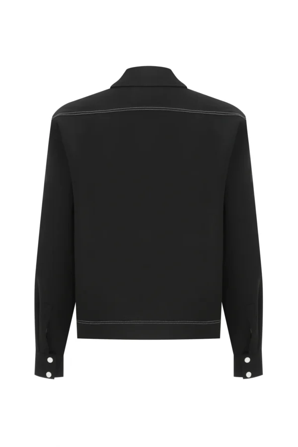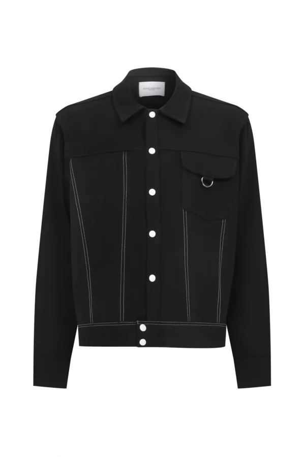 Kalın krep kumaştan üretilmiş üzerinde beyaz punto dikişler olan oversize kalıp ceket