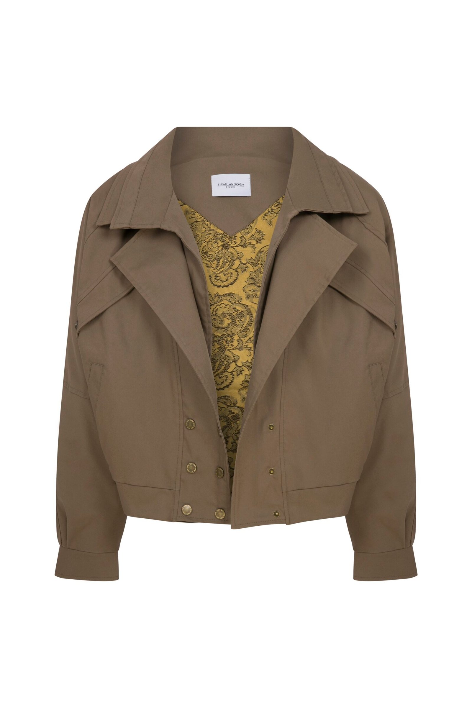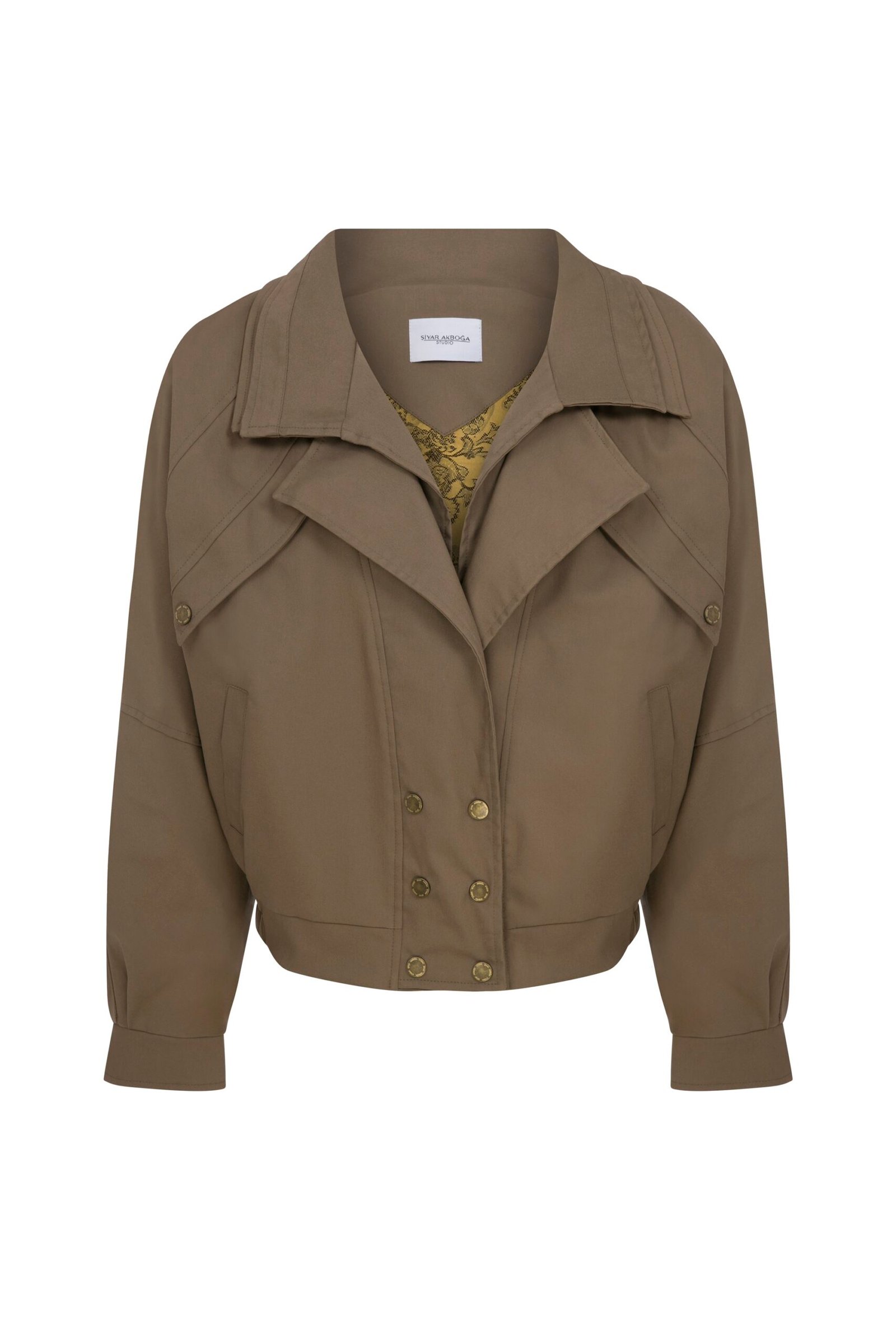 Bomber ceket formunda üretilmiştir Oversize kalıp rahat bedendir Belden lastikli Önden çıtçıt detaylı Katmanlı yaka detaylı Kol manşetli Desenli astarlı