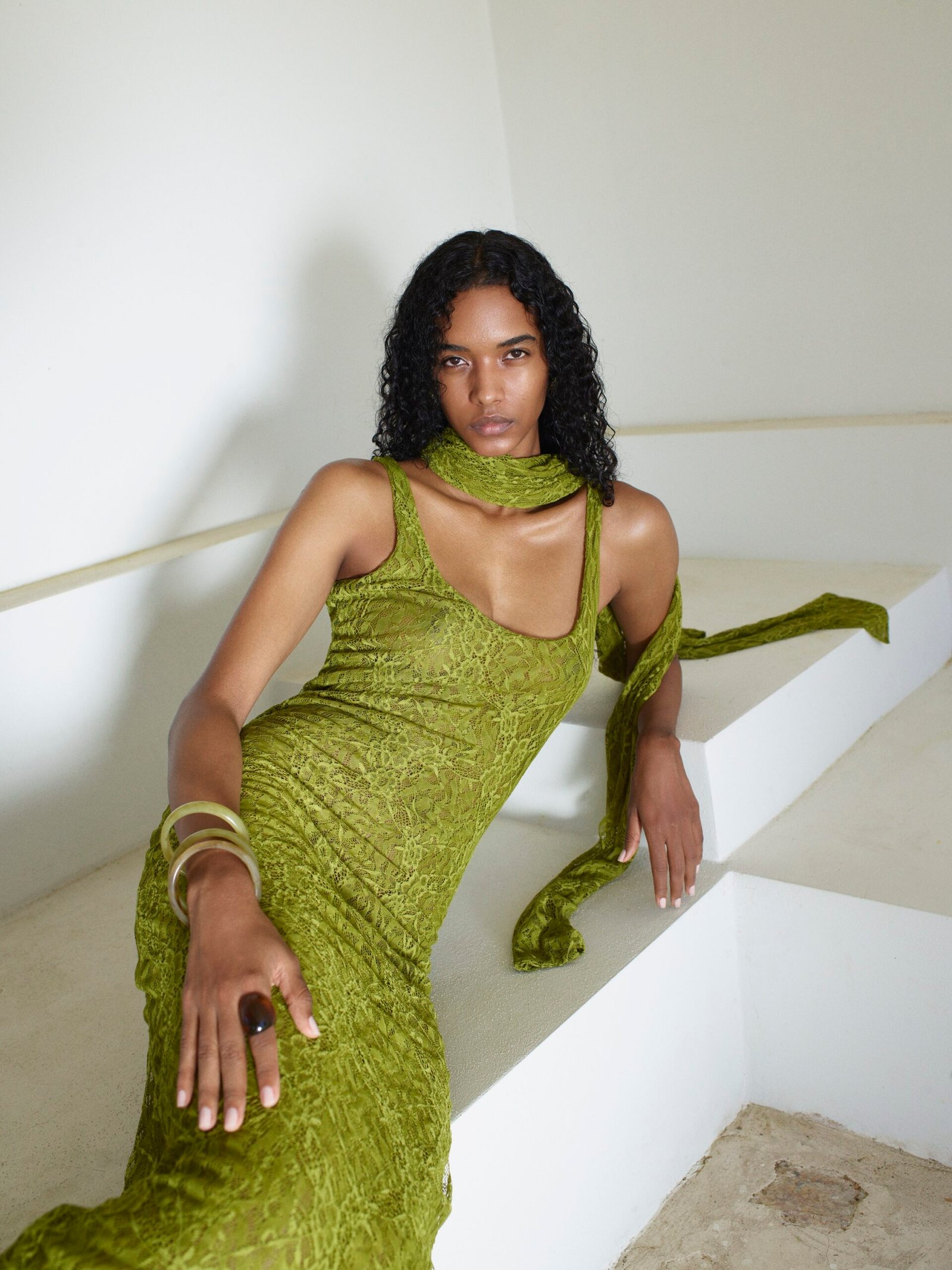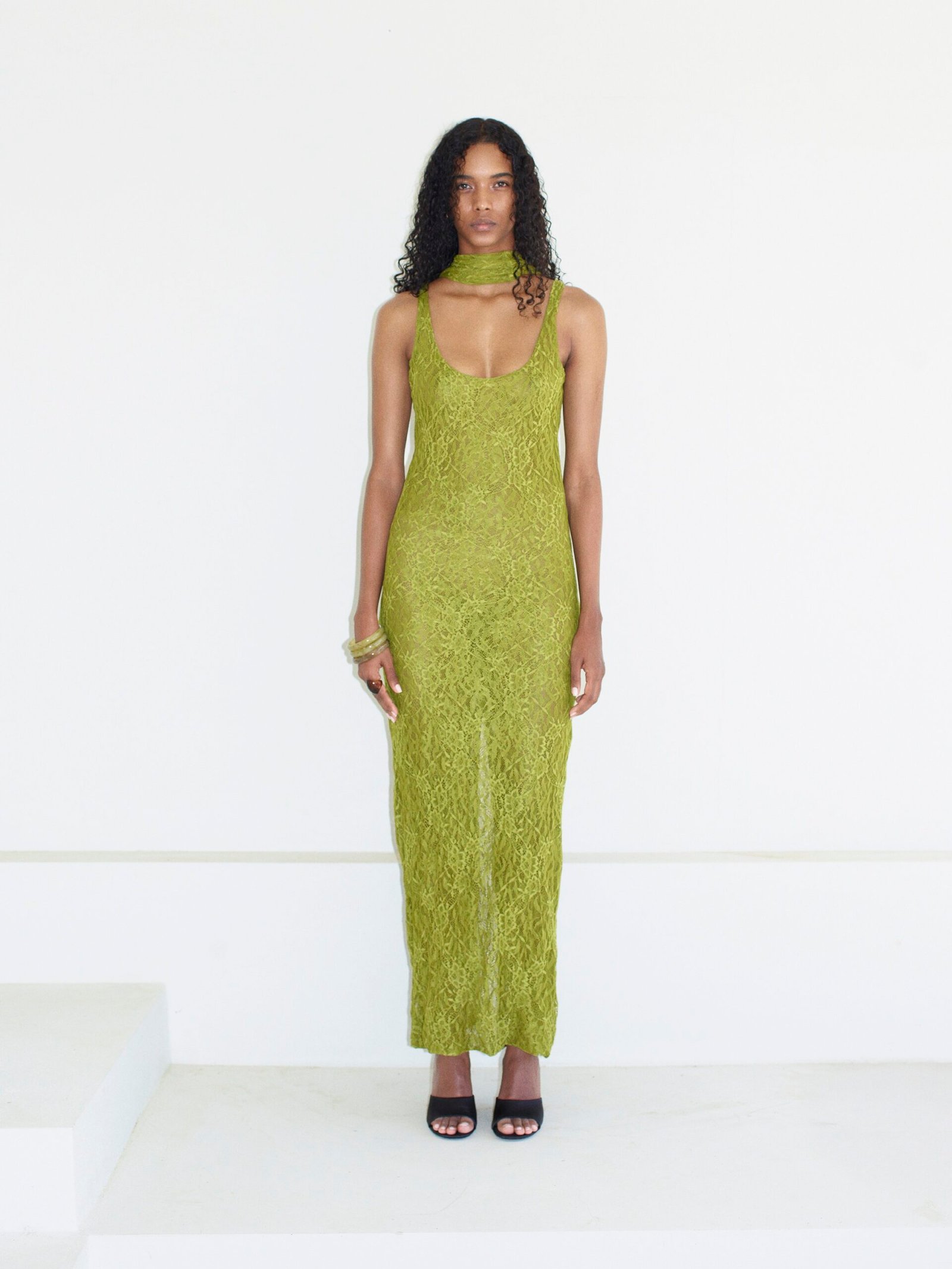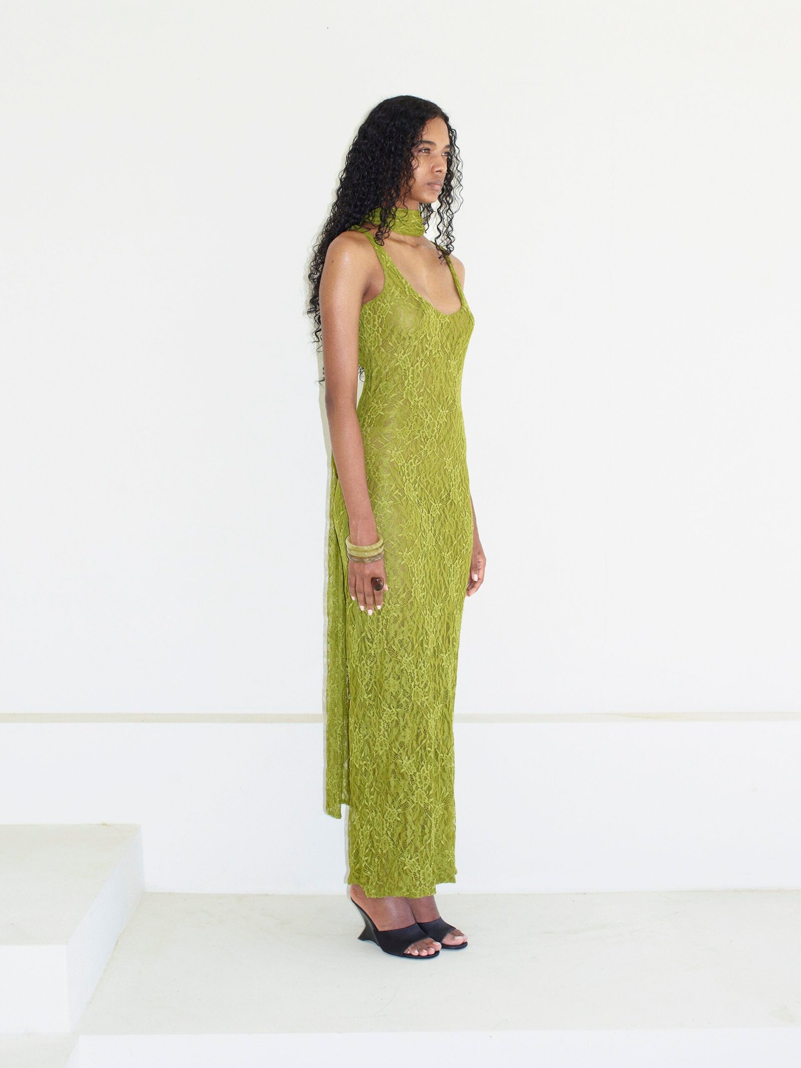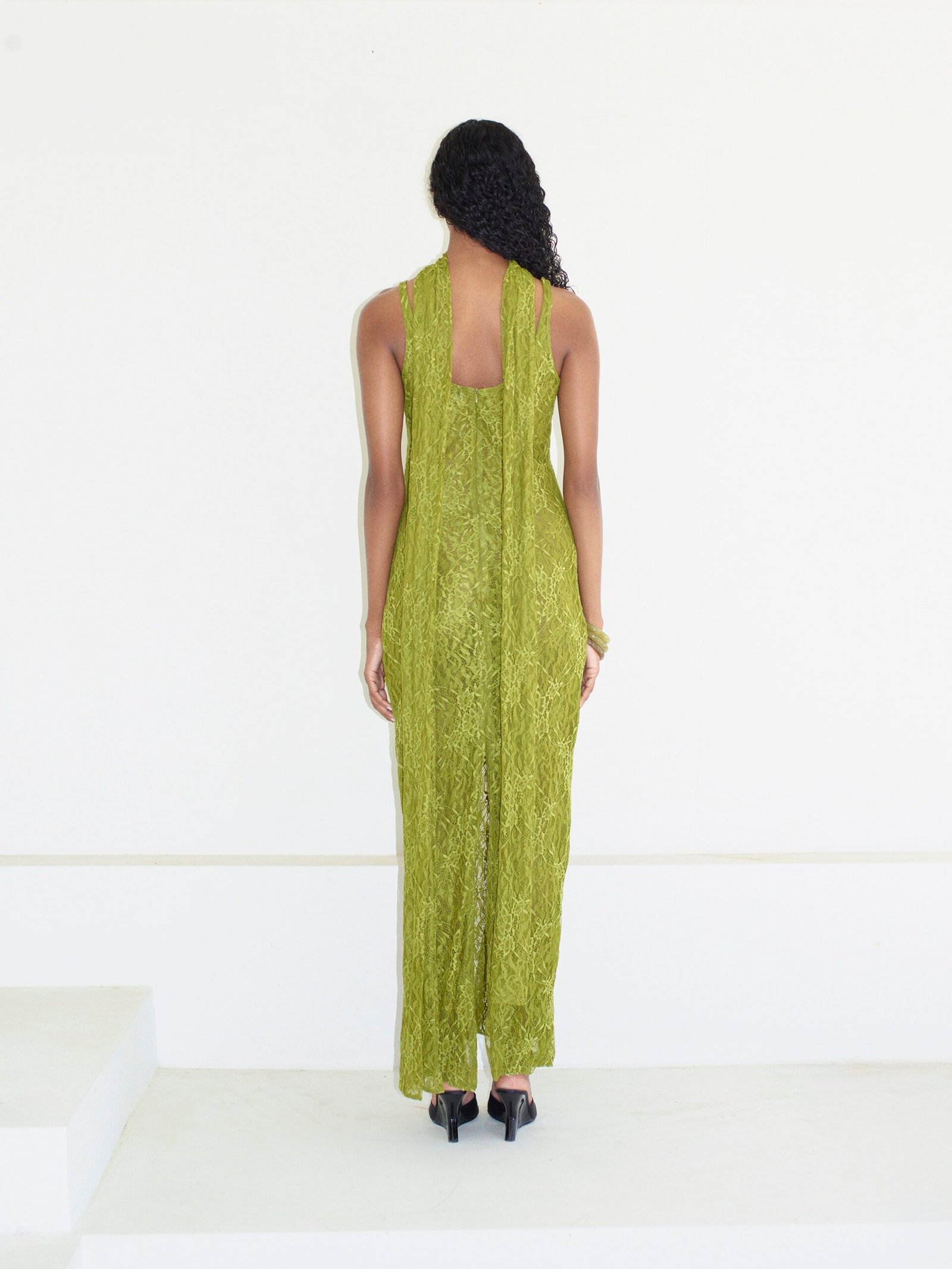 Atlet yaka maxi boy elbise Likralı fransız dantel kumaştan üretilmiştir Arkdan yırtmaç detaylı Arka ortadan gizli fermuarlı Ayarlanabilir şal yaka detaylı