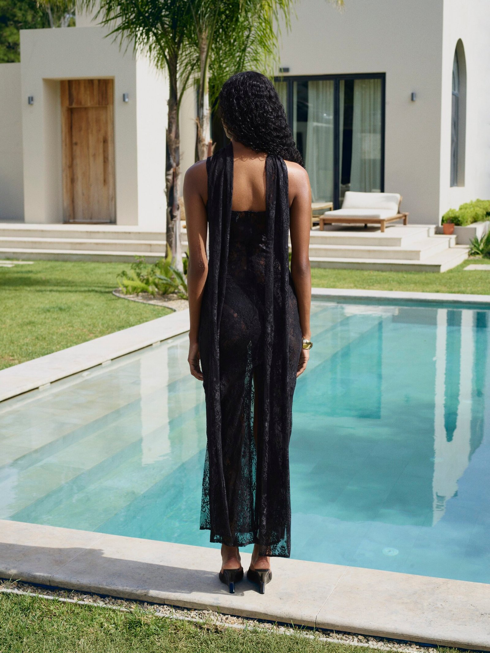 Fransız dantel Kendi kumaşı ile dublelenmiş Atlet yaka elbise Arkadan fermuarlı Ve yırtmaç detaylı Ekstra fular detaylı