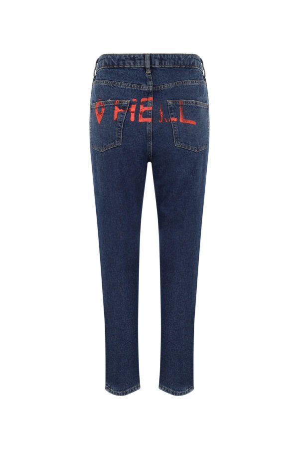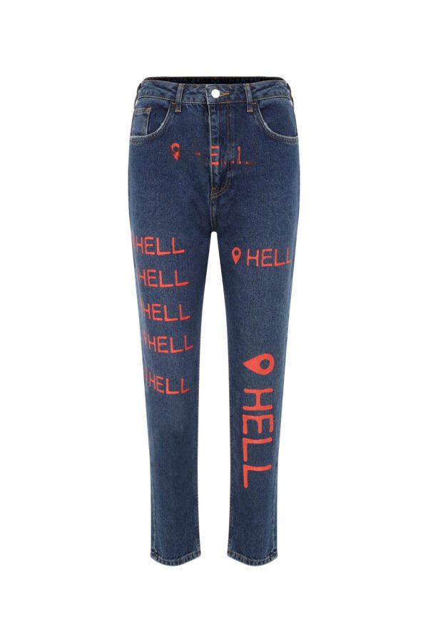 Yüksel bel yumuşak denim den üretilmiş serigrafi baskı ile yapılmıştır