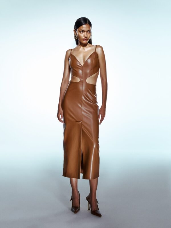 LEATHER WAIST DETAILED DRESS BROWN